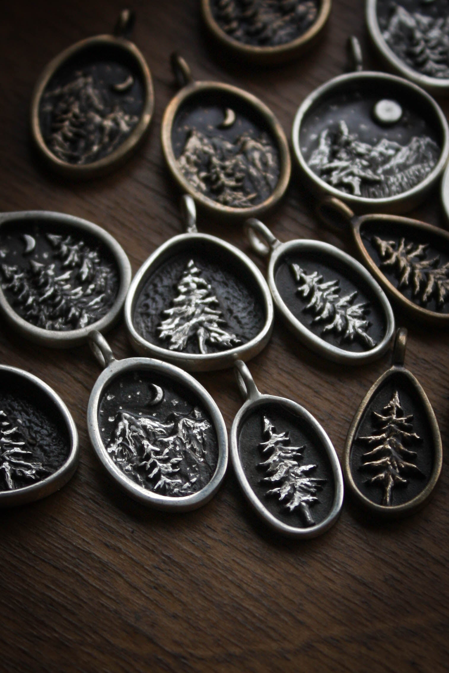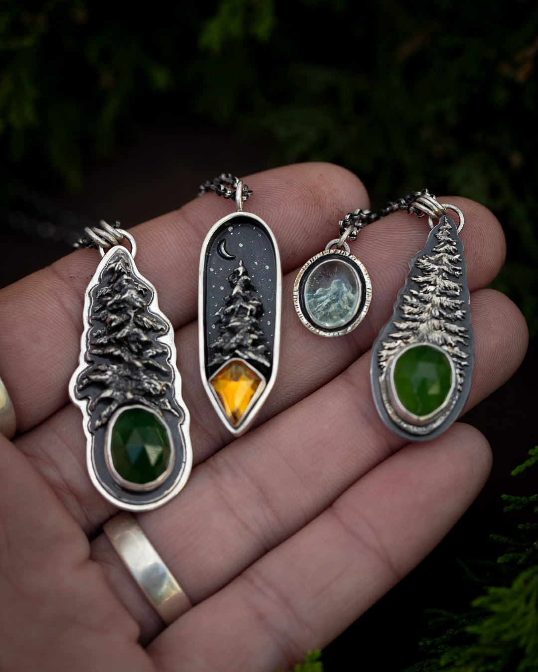 Even on a busy work day, these pieces transport you into lush forests, towering mountains, and alpine meadows. They are the perfect size to always hold nature to your heart.